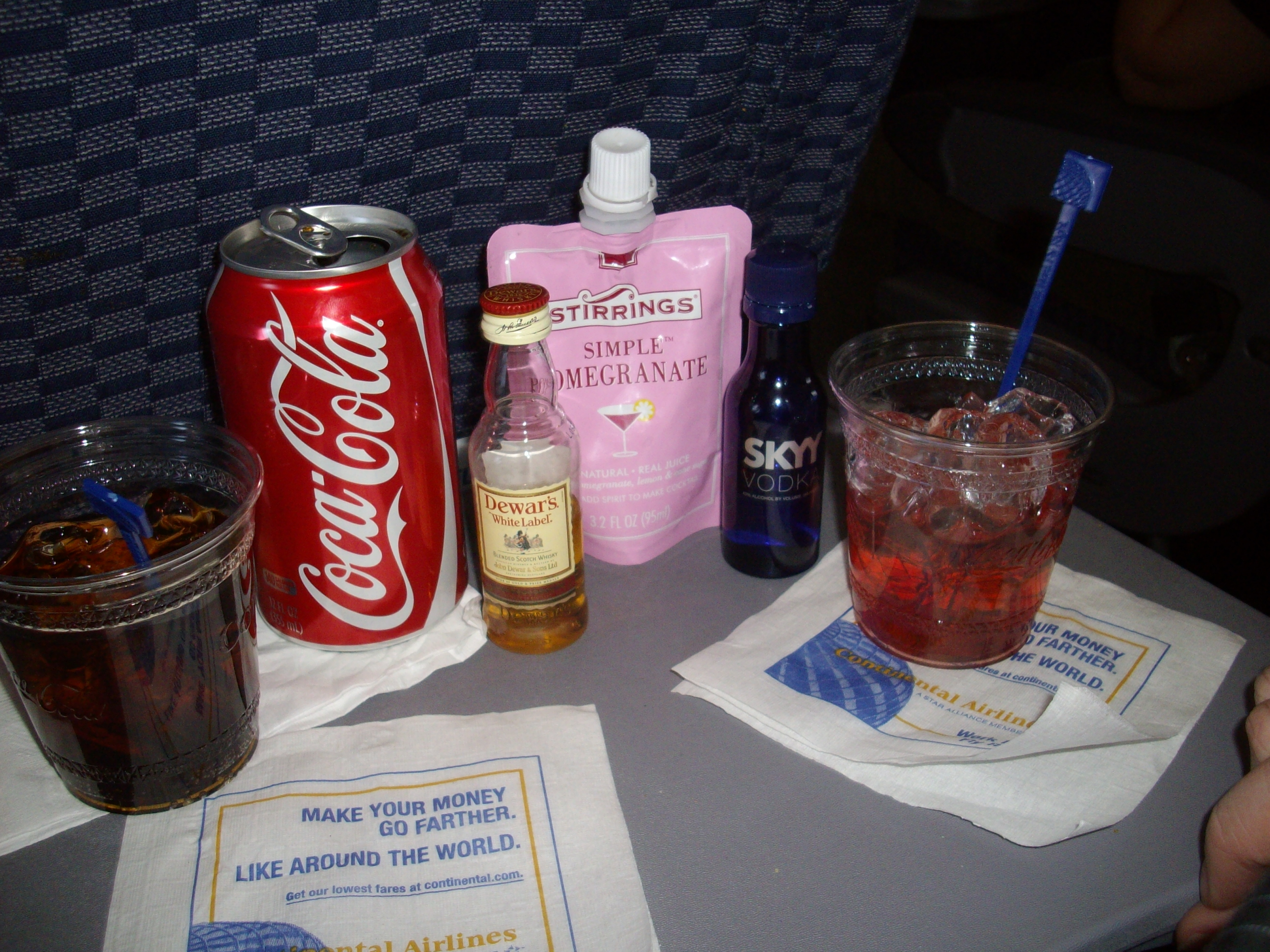 Finally, I discovered, through trial and error, that I needed to ask for a ‘Dewers and Coke’. Dewers being the name of the Scotch Whiskey they served on board. Oh, and my travelling companion… he needed to ask for a ‘Skyy and Pomegranate’.