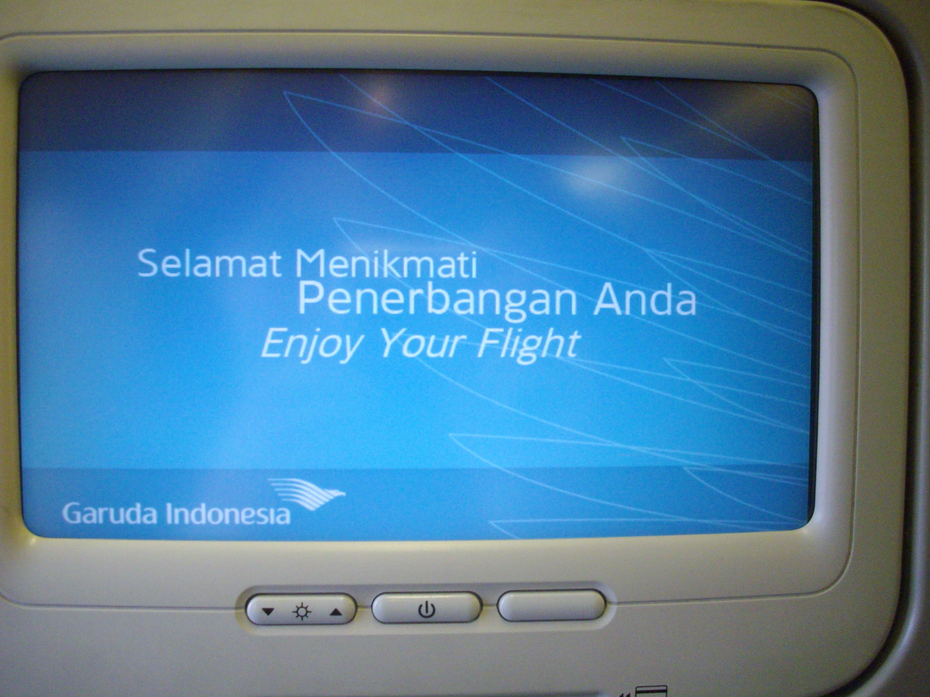 Soft green seets and brown headrests were pleasant looking, as was the private tv screen (AVOD) in each seatback flashing between ‘Welcome Aboard’ and ‘Enjoy Your Flight’ in both Bahasa Indonesian and English.