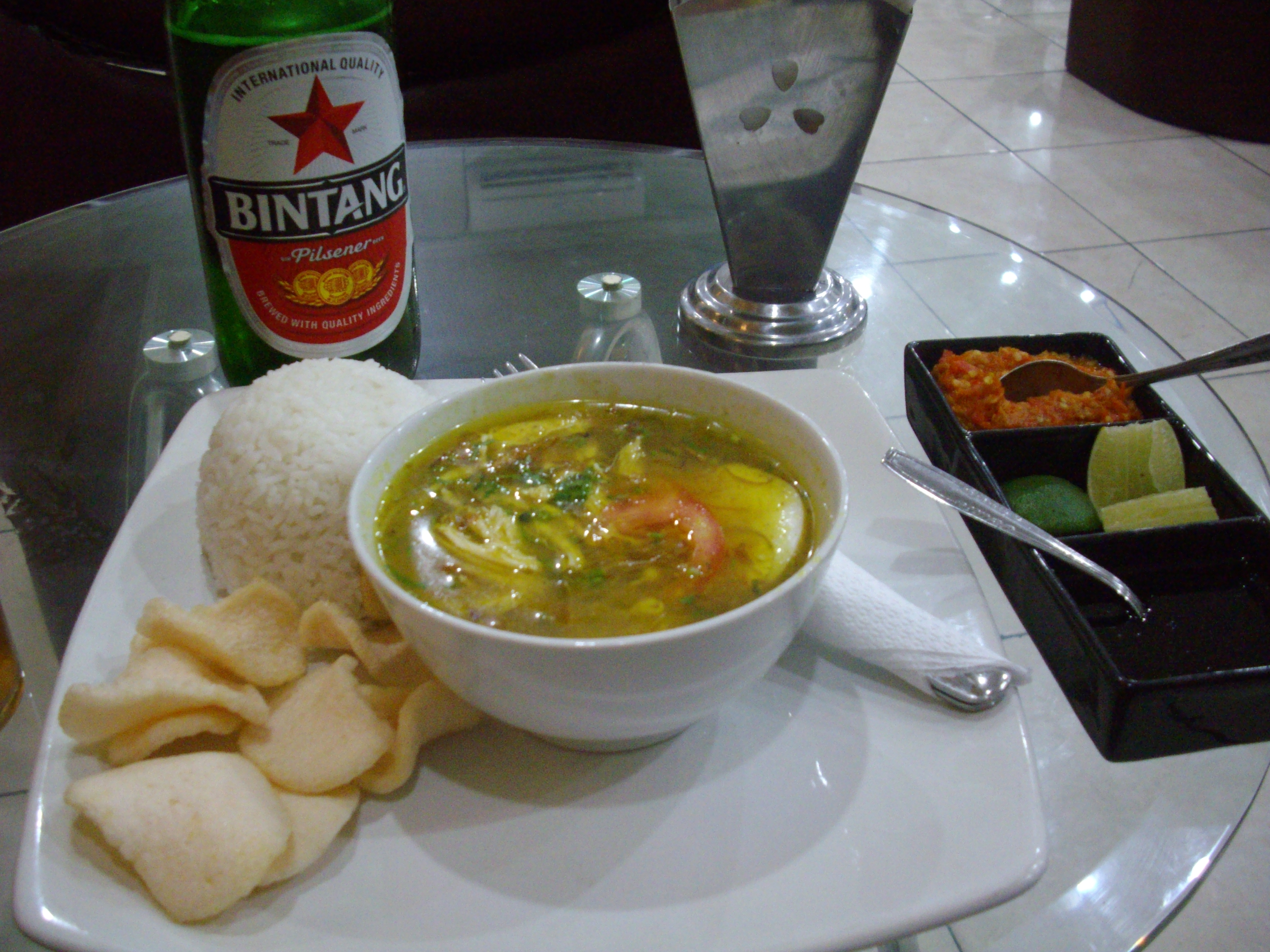 Now I normally wouldn’t blog about food, unless it was airline food, but I was waiting for a flight in an airport, so it kind of counts, right? From the menu I ordered Soto Ayam, I believe it was the local Yogyakarta version (there are several similar versions throughout Indonesia) and a Bintang beer. The soup was divine, the yellowish stock, from added turmeric, had a slight viscose texture. It was very flavoursome with huge chunks of white chicken meat, tomato, egg and noodles in the soup. On the side came prawn crackers and a dish consisting of chili flakes, lime wedges and kecap manis condiments. As simple as it was and so very local, this was the best dish I experienced on this trip to Indonesia.