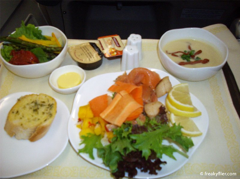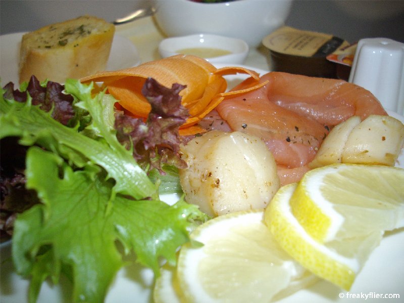 The flight attendant pulled out my tray table from the arm rest and laid out a starched table cloth before an Amuse Bouche, bite sized Hors D’oeurve was served as the first course. These delicious morsels on rounds of toasted bread consisted of coral lettuce, rare beef and melon and a sprinkling of parsley on one, a seared scallop with dill mayonnaise and baby tomato on another and lettuce, smoked salmon and caviar on the third. Each were equally delicious but if I had to choose one I would say the scallop was the best.
