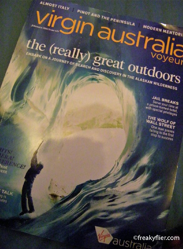 The trolley made its way down from the front to the rear with a passenger name list and crew members Olga and Craig ticked off the names of those on the flexi fare as they handed out a smallish hot meal, which from peering at the persons meal behind me, was (what looked like) a ravioli with pesto with a side of tiramisu. Still hungry, in fact ravenous, I studied the menu, located at the back of Virgin Australias ‘Voyeur’ inflight magazine and my mind wandered back to when I made the online booking – why didnt I buy the flexi fare?… Oh yes, the flexi fare was $249, my saver fare was less than $100! Eventually, the trolley’s made their way to the last row and then they headed way back up the front again this time filled with food for purchase.. With it now dark outside the larger windows and no entertainment whatsoever I watched the trolley crawl its way, row after row, down the aisle.