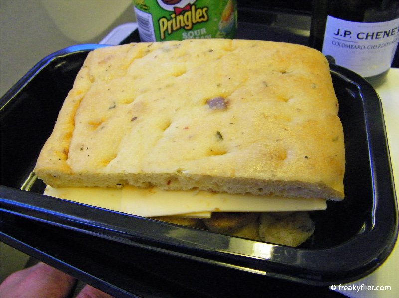 Pretty much 15 minutes after take off the crew set about serving meals to the ScootBiz passengers and guess what I got? The Beef Focaccia I had ordered online for my original economy ticket! I didn’t mind, because it was what I had ordered, although it was one of the cheaper and lighter meals and not from the airlines premium meal selection. The meal included the focaccia, a small tube of Pringles and a drink – which I chose a 187ml J.P. Chenet Colombard Chardonnay. The beef was cooked rare, still succulent and tasty but, the focaccia itself tasted a little dry, nonetheless I did put that down to the loss of taste food gets at 30,000 feet. The Pringles came in handy later in the flight when it was time to settle in and watch a movie, with a purchase of another piccolo of wine for SGD$8. As I was paying by credit card, one of the lovely crew members who served me the drink, asked if I would like to leave the card in the galley, like leaving the card behind a bar and running a tab…wise idea? I’m not sure 😉 .