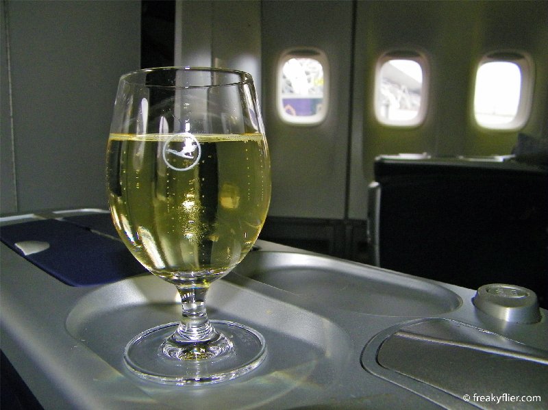 As soon as I was seated a flight attendant, who greeted me with “Sprechen sie Deutsch oder Englisch?” – “Do you speak German or Enlgish?” (I do speak German, however I was thinking in English, my mother tongue, at the time so I answered “English”) offered me a glass of orange juice or champagne and obviously as the picture above shows, I chose the latter.