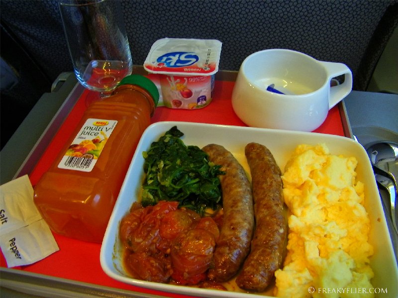 O.k. so lets get to the breakfast, the dish – scrambled eggs, sausages, tomatoes and spinach – was pretty good. I’ve had several breakfasts on flights with greyish rubbery eggs and tastless dry sausages but the eggs here were light and fluffy and the sausages were packed with flavour and still juicy! The tomatoes and spinach also quite flavoursome.