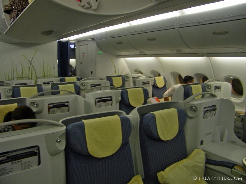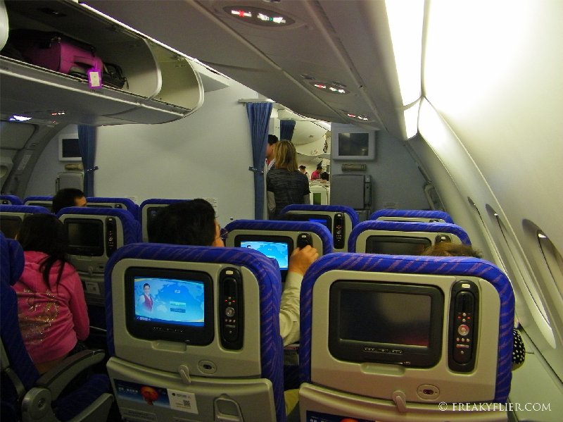 One aerobridge connected the gate to the upper deck from the front of the aircraft meaning the rear economy passengers made their way through the Business Class cabin. Just as I reached my Economy Class seat an annoucement was made by the cabin crew that if anybody in Economy wanted to upgrade to please see the crew and all major credit cards were accepted. Obviously, I enquired on how much the upgrade would be and was informed CNY4,700 which I worked out to be around AUD$850. I said I would think about it and sat there for quite a few moments trying to decide what to do. In the end I decided not to take up the offer, even though it was a very good price, but I was settled in my seat and at that time couldnt see much more of a benefit other than the lie flat bed, which was going to cost me around an additional AUD$100 per hour on top of what I had already paid for my economy ticket.