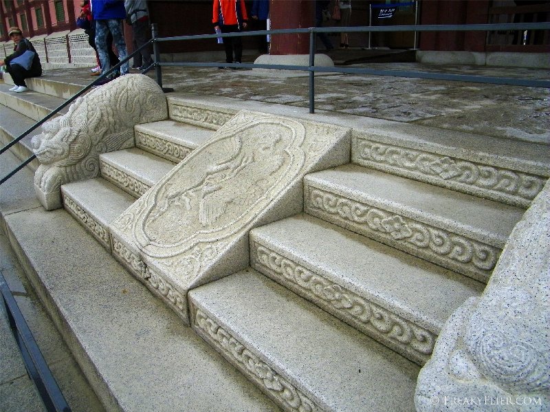 The marble steps to the throne room sit either side of the intricately designed sloping middle stone, where only the emperor was permitted to travel over. However, the Emperor wouldn’t walk, he would be carried in a sedan chair over said centre, which is carved with an ancient phoenix.