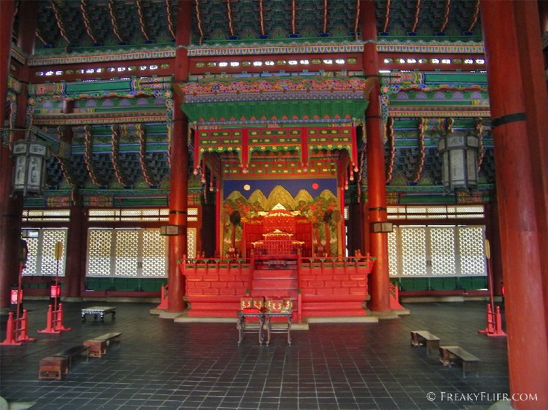 The stone courtyard features two rows of pumgyeseoks – ‘rank stones’ where the officials stood according to their rank in front of the Throne Hall or Geunjeongjeon – meaning diligence helps governance. The building is situated in the centre of the courtyard surrounded by wooden cloisters. Geunjeongjeon is where the Emperor delivered edicts to his parliament, greeted international diplomats or gave important speeches.