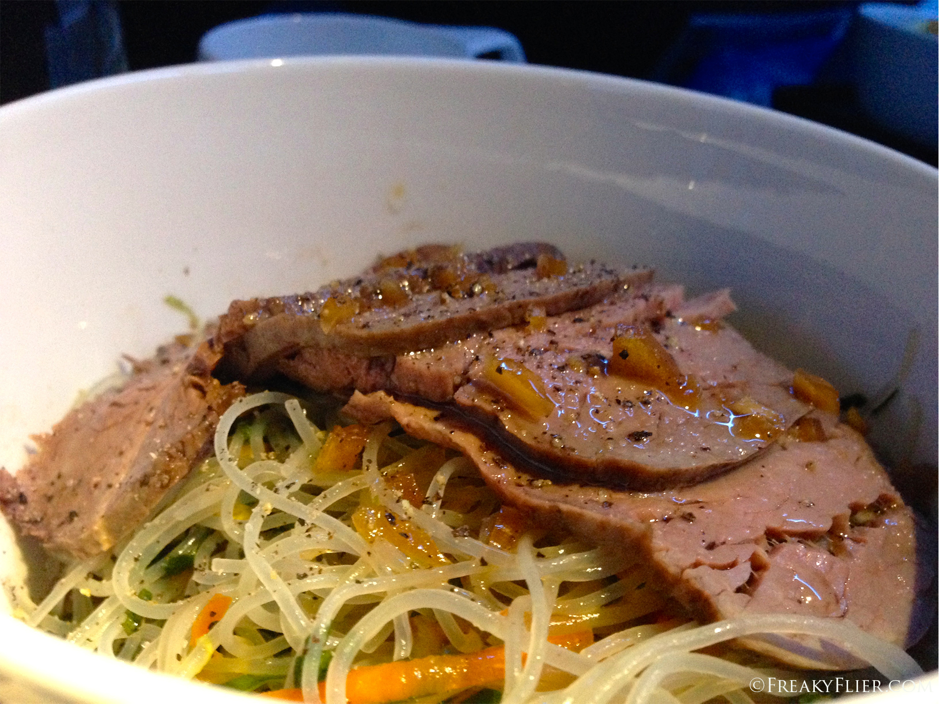 The cold beef dish was fab. The thinly sliced pieces of rare beef had a lovely soft texture that almost melted in the mouth. The glass noodles were perfectly cooked, not too hard and stringy nor too soft and mushy with my tastebuds welcoming the fragrant hits of thai herbs such as lemon grass, and coriander and a slight punch of chilli, which made the dish really spectacular. The only thing I will say is that it was one of those dishes I usually don’t like to eat in public, slurping up noodles that splatters the sauce everywhere isn’t a nice look in Business Class, but I did my best to keep it clean.