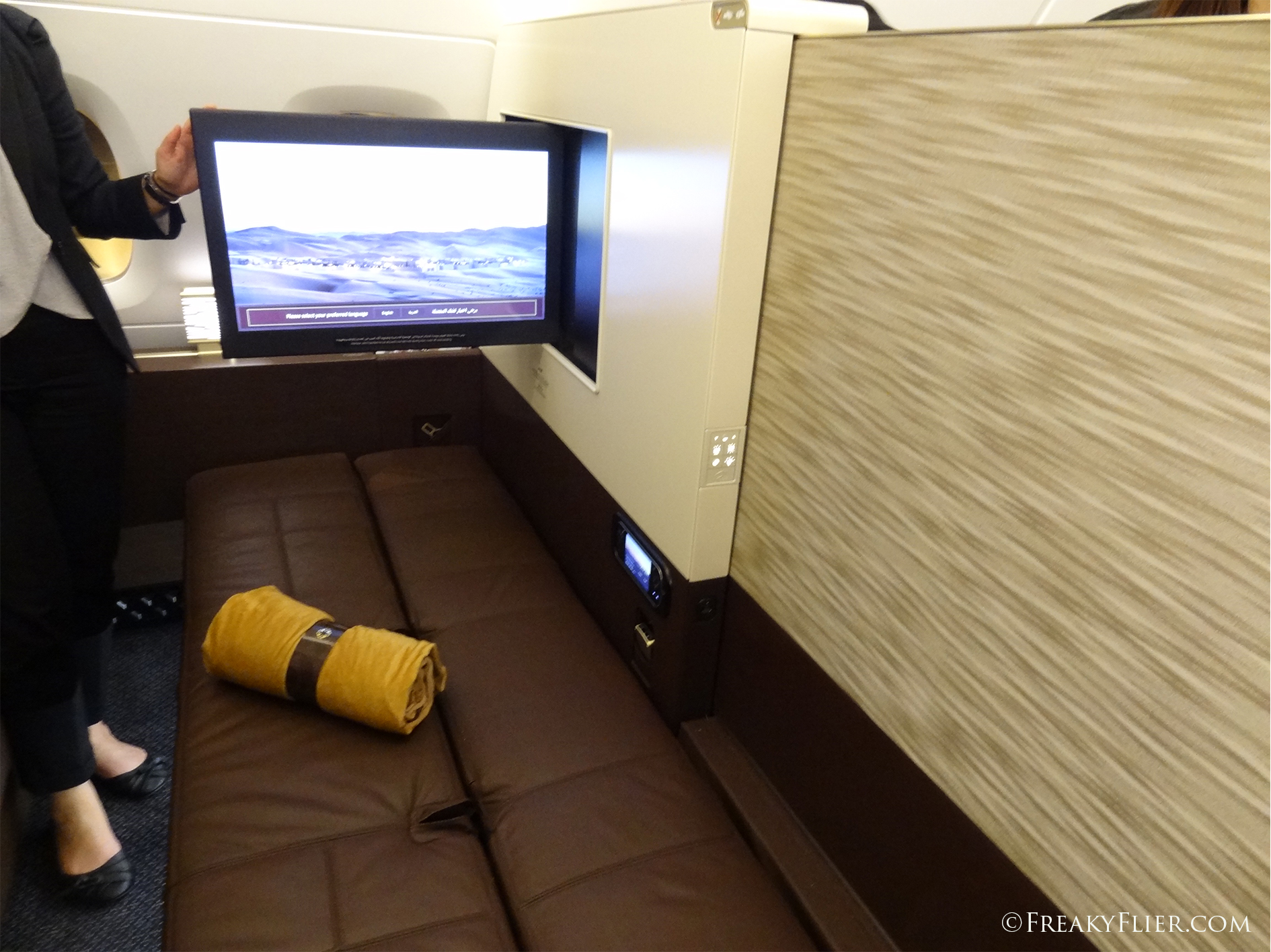 Still cant sleep? Finish that movie with a second 32″ flatscreen TV at the end of the bed. WOW. Due to safety when turbulence occurs, there is a peephole the Cabin Crew can check into the Residence bedroom to make sure your seat belts are still on, so hey…. don’t get too romantic!