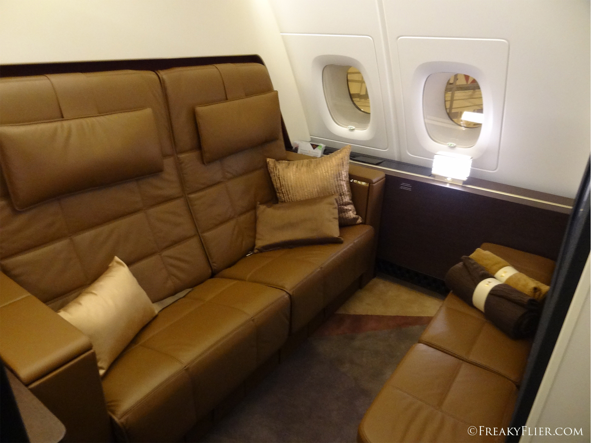 On our way to the First Apartments we passed The Lobby, an area of the upper deck located between the premium cabins where the Premium Class passengers can mingle. After take off a table is centred in the middle and there is a stocked bar available. The seats come with seat belts so in unexpected turbulence there are no injuries.