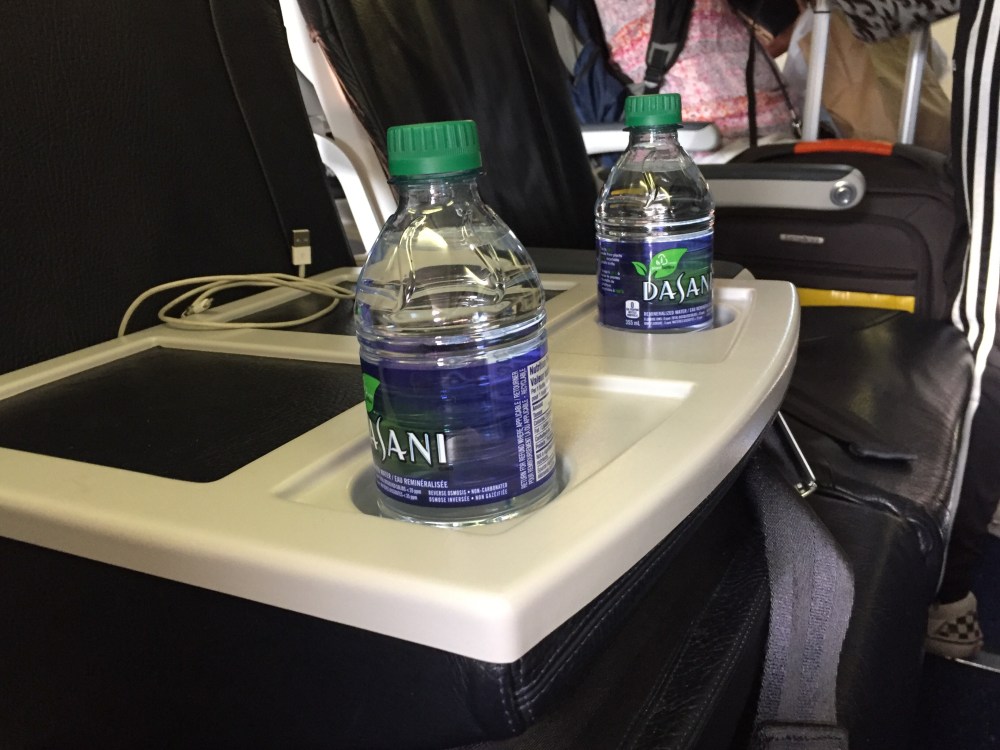 On the centre seat table comes 2 bottles of water, a nice touch for the Economy Plus passengers. The extra leg room, extra shoulder room with the side table and a bottle of water, I’m thinking this Economy Plus thing is pretty darn good but it gets better.