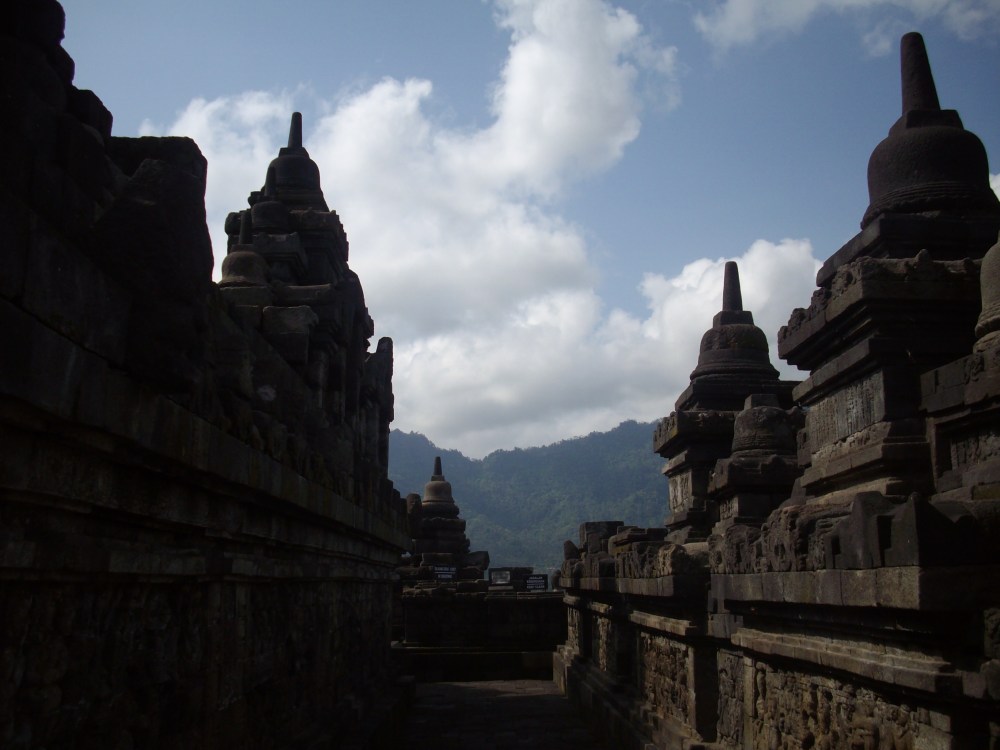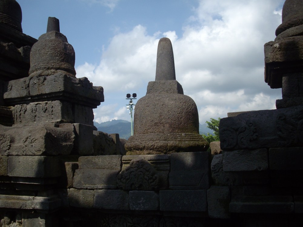 Still affording magnificent views, the stupas of the last level have a square pattern in their structure and lead up to the solid central stupa.