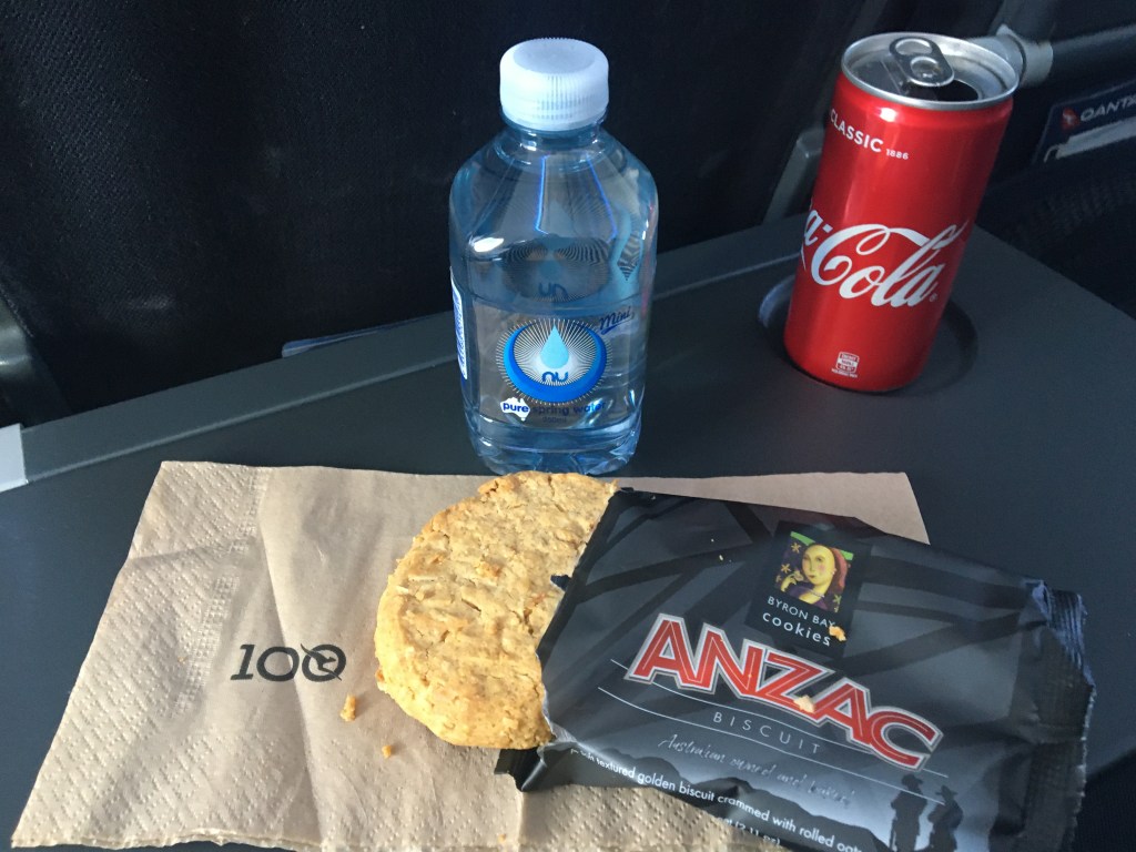 I was slightly disappointed with the meal service on this ‘breakfast’, 2.5 hour flight. It was Anzac day, so I guess the Anzac biscuit was appropriate but I would have preferred something more substantial, especially since there was not much open at the international airport. The strange thing is I could’ve ordered a special meal, for dietary or religious reasons, online prior to the flight. I do understand the many COVID-19 related reasons why it was just a biscuit though. A small bottle of water and a choice of soft drink, juice tea or coffee was also available with the inflight service.