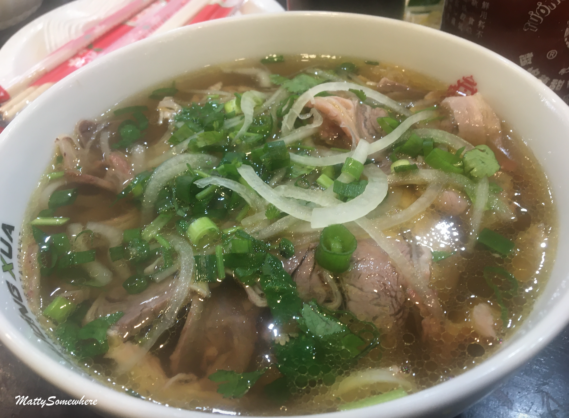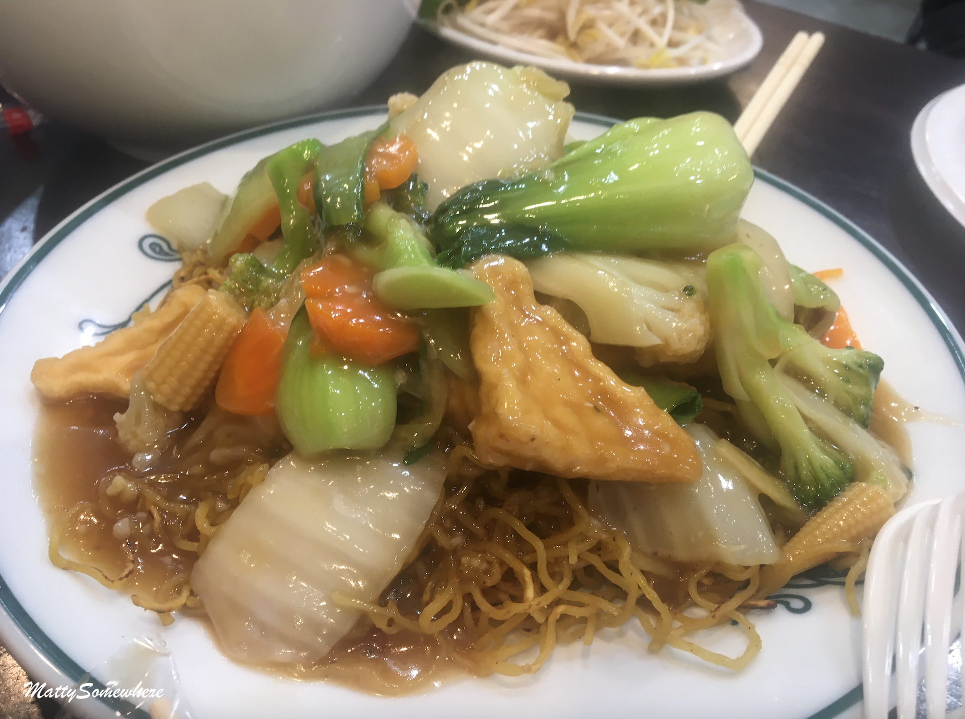 The beef brisket phở is first to arrive and there are three large bowls for the six at our table but only two of us eat meat. The lovely owner tells us to always try phở first before adding condiments which here are bean sprouts, Vietnamese mint, lemon, sriracha and soy. This is a great dish, there is a depth of flavour in the broth including star anise. We are informed the beef is slow cooked for 12 hours! Having travelled around Vietnam on several occasions, I can confirm it certainly has authentic flavours. Of course, I end up splashing most of mine over my shirt – but thats just me!