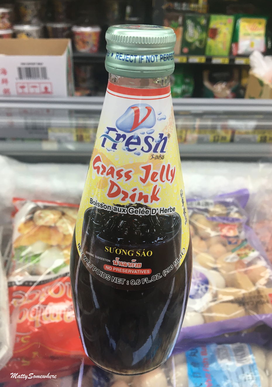 We have entries such as fish and mozzarella on a stick and salted jellyfish. My entry into the most unusual find competition is the grass jelly drink and…. I win!