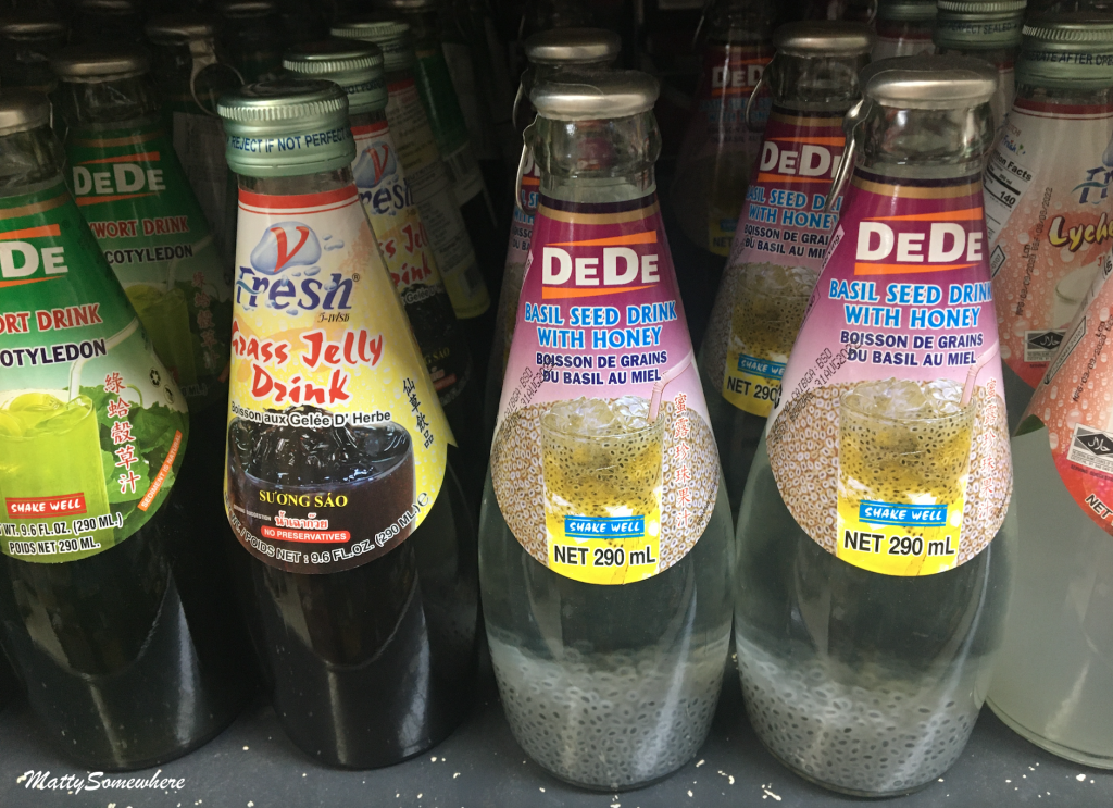 I first spy the basil seed drink with honey, but then I see the grass jelly drink and notice the jelly like grass strands inside the bottle.