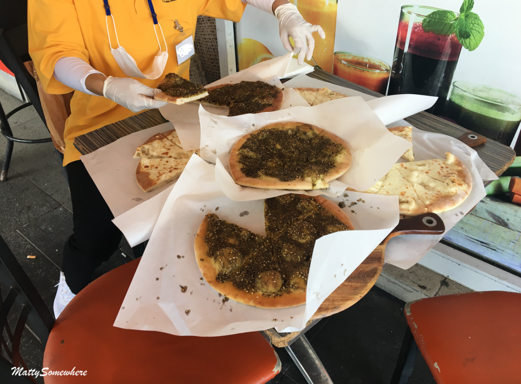 There is cheese manoush and zatar manoush and both are equally delicious. While I am a fan of zatar, the cheese is heart meltingly good. There is a bit left over and this is the point some take away containers come out from the bags of the others on tour – why didn’t I think of that?