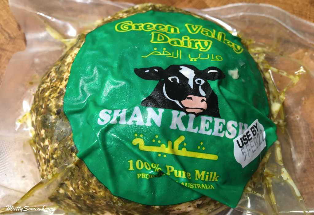 Tasting similar to goats cheese, slightly salty and slightly sour, shan kleesh is rolled in spices and herbs and zatar which gives it a herby flavour. A packet is also added to Jen’s shopping bag.