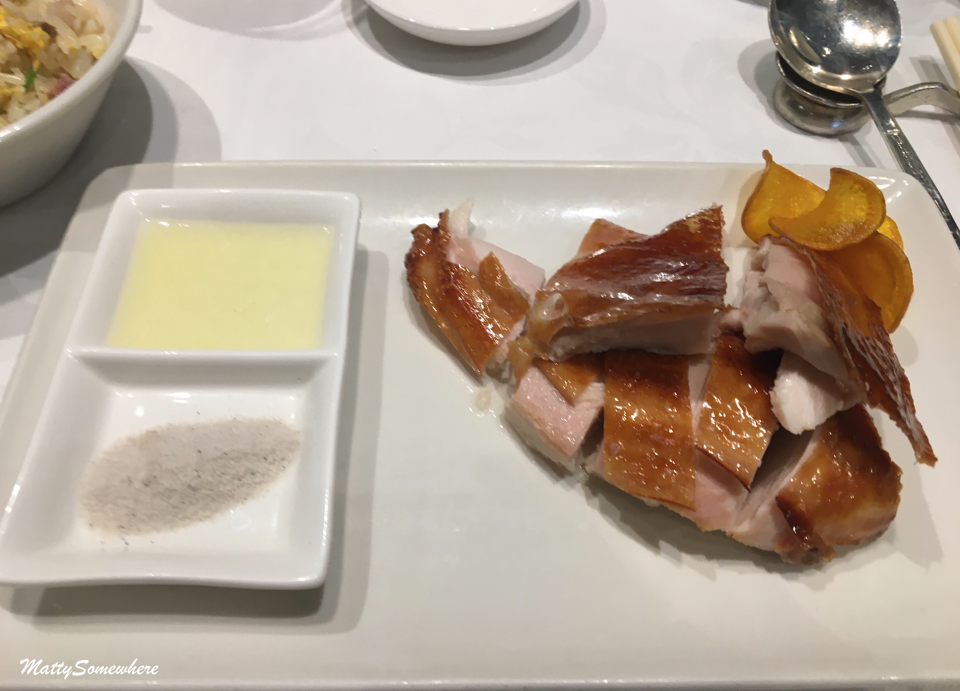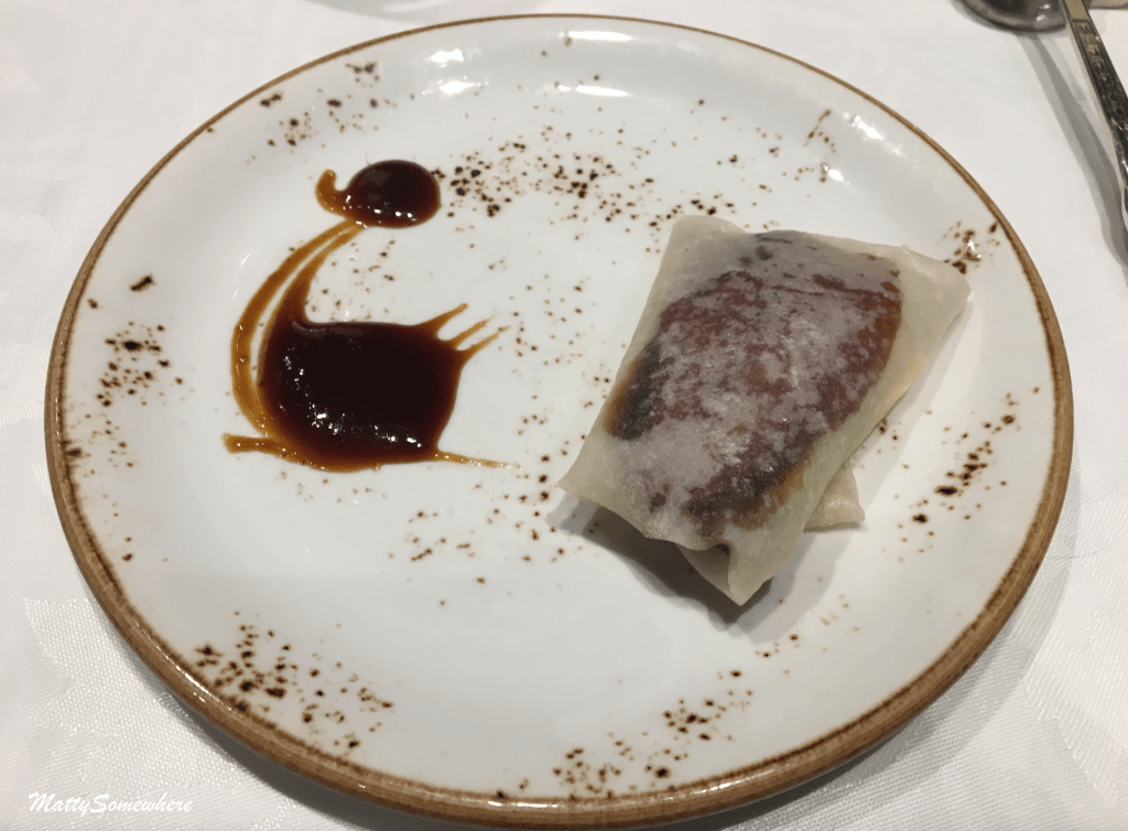 Peking duck – Roast duck wrapped in pancake with cucumber, spring onion and plumb sauce. I love the hoisin sauce on the side in the shape of a duck! The duck pancake is divine. The skin is crispy and the duck not chewy like I have experienced at times. I devour this and then I see a second serving coming for me and I am delighted to have it!