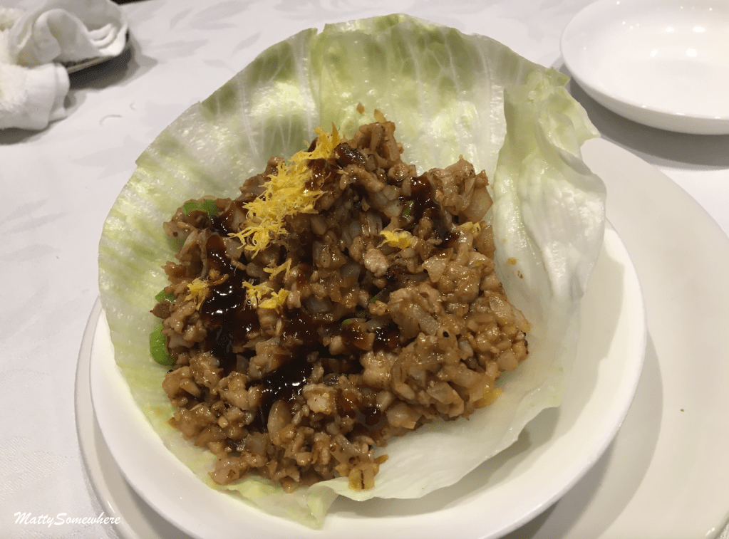 The quail sang choi bao is described as ‘Minced quail meat cooked with Chinese sausage, shitake mushrooms, bamboo shots and spring onion served in a lettuce leaf’. This is Jen’s entree, she loves it. I try a bit and think it’s wonderful as well.