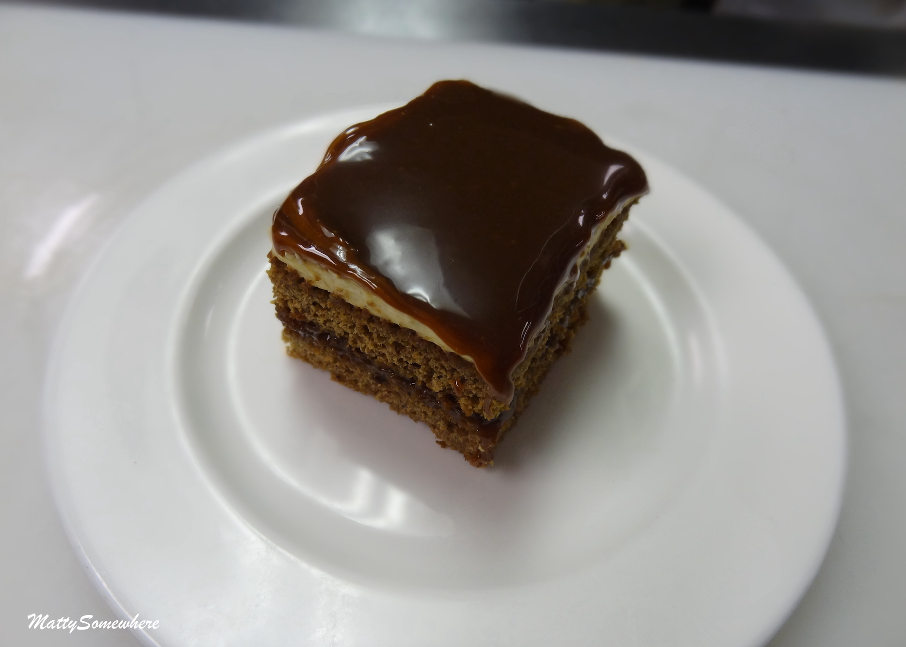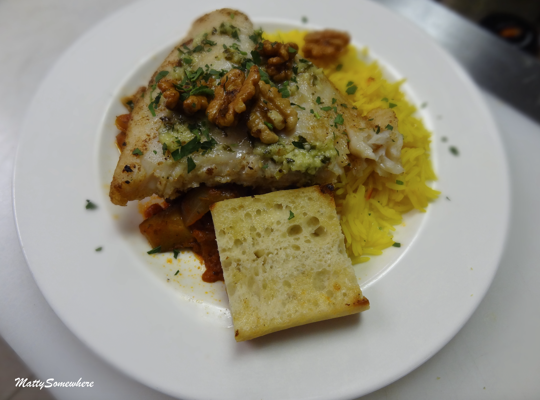 The fish was atop some ratatouille, with a side of saffron rice. So the spongy piece turned out to be a piece of toasted bread. And that crunchiness on the fish… walnuts… Again, I couldn’t have picked all the flavours individually.