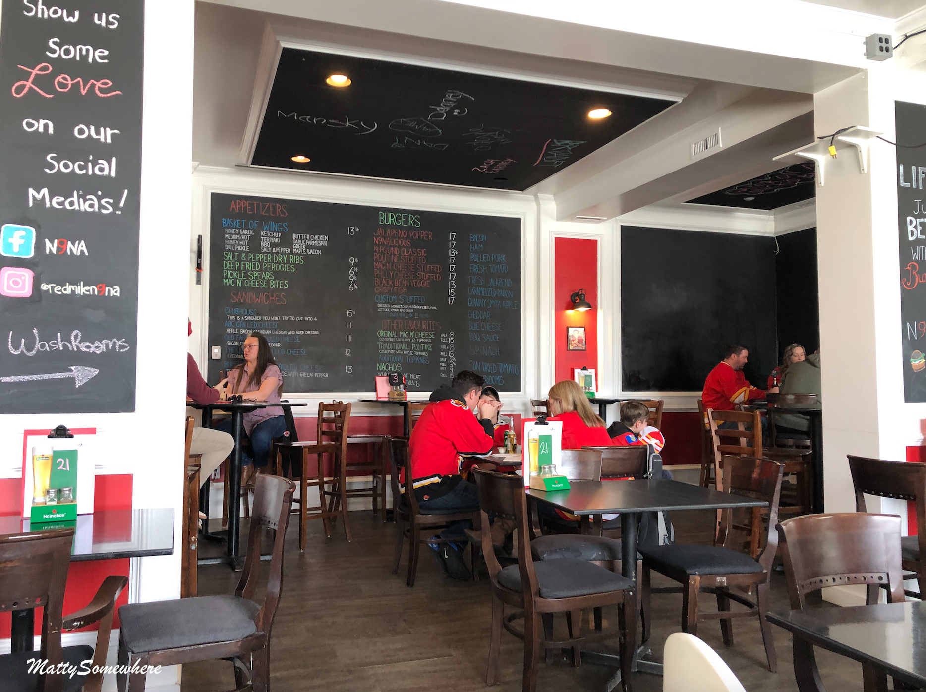 The restaurant has a few people grabbing lunch before heading to a Calgary Flames hockey game – Go Flames, GO!