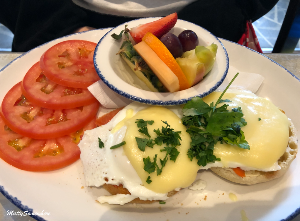 Cath chooses the Dutch Benedict. The can be served on a traditional Dutch rusk (kind of like a dryer harder english muffin) or an English muffin, Eggs done traditionally poacher or scrambled with hollandaise sauce and a choice of sides, salad, fruit, tomato or avocado. My food envy is cut short as we share both of our meals. The eggs benny is by far my favourite.