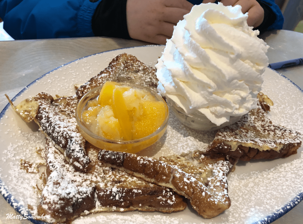 The kids go for a sugar hit breakfast – Dutch French toast – Hot cinnamon apples and icing sugar made with Cobs cinnamon bread and a choice of fruit topping (on the side) here we have raspberry…