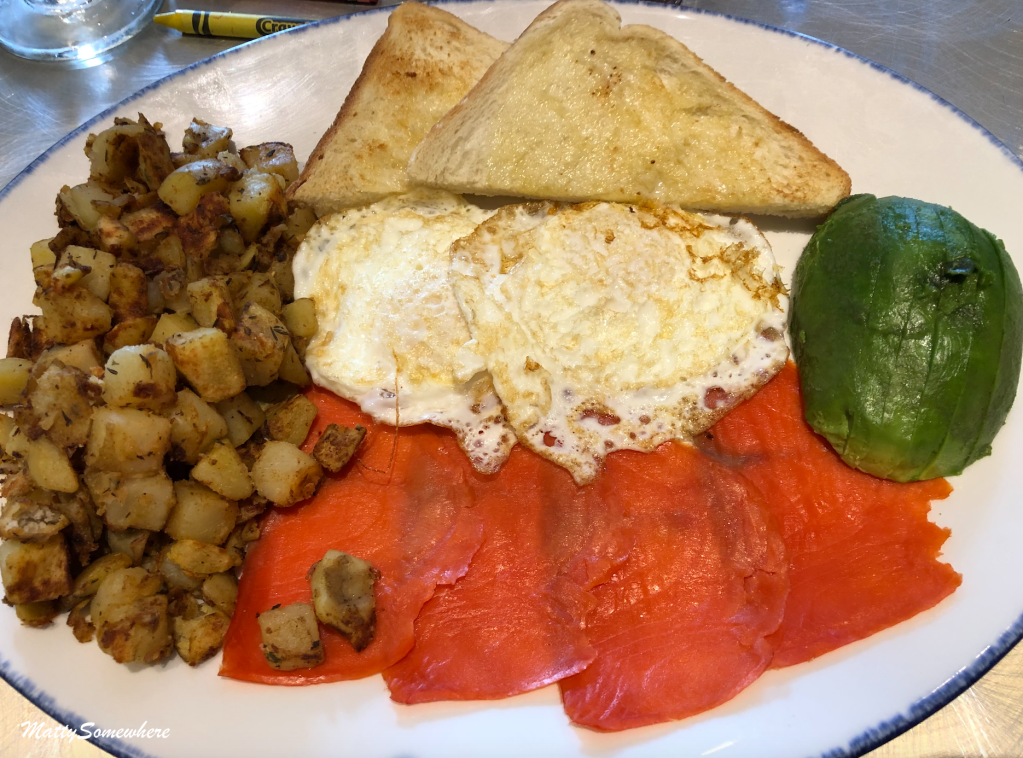 I go for the breakfast platter dutchman style – two eggs and toast with a choice of two sides (choices are DeBakon, ham, sausage, turkey bacon, grilled mushrooms with tomatoes and Dutch cheese, Beyond Meat vegetable patty, avocado, potato hash, bratwurst or chorizo) – I go for the smoked wild BC salmon, potato hash and avocado. The dish is great, the salmon is deep red in colour and very tasty – I reckon Canada has the best salmon in the world! But I get food envy….