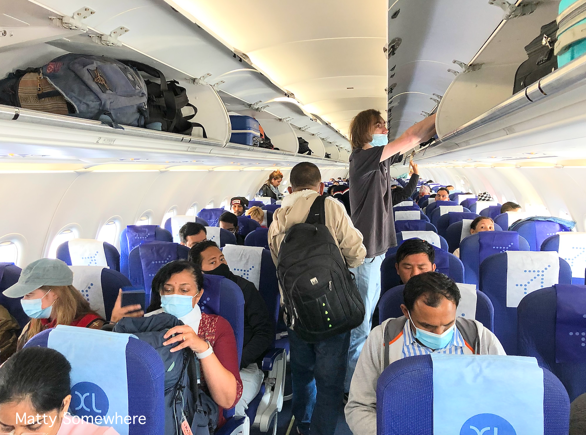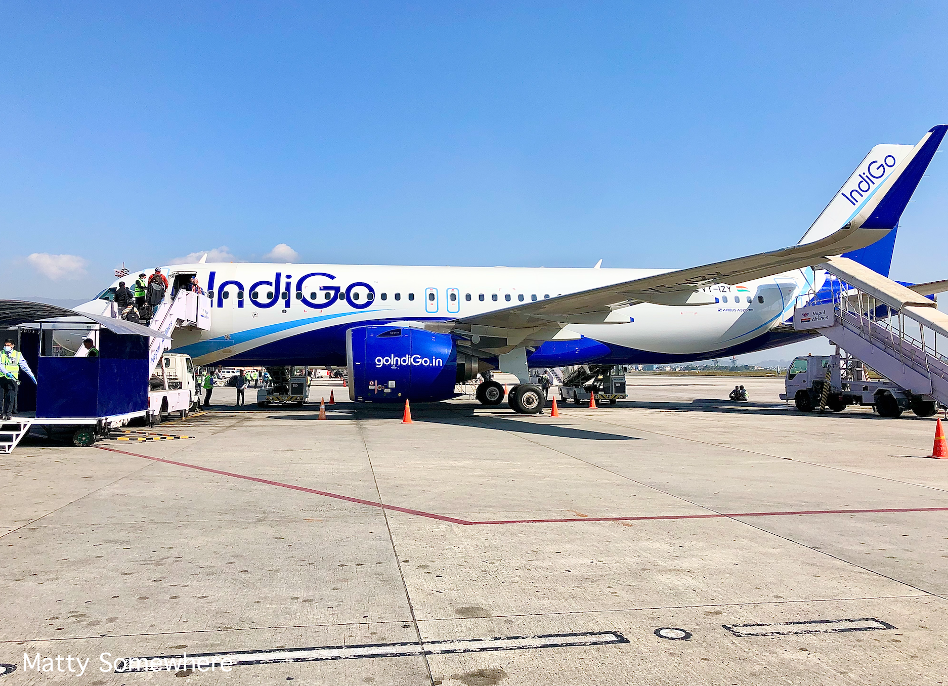 The amount of time spent in lines meant we were only at the gate a few minutes before boarding. Indigo has been ranked the third most punctual airline in 2021 by the OAG punctuality guild, and thus boarding was called on time. The aircraft operating our flight to Delhi was a three and a half year year old Airbus a320 registered VT-IZY. After being bussed to the aircraft (there are no aerobridges at Kathmandu Airport (KTM)) we entered via the forward stairs, as did all.