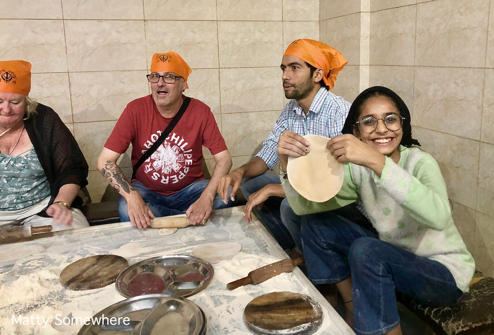 The kitchen is staffed by community volunteers and anyone, Sikh or not, may give their time to help out. This can be to make just a few chapati breads or several hundred. We decide to sit down, take up a rolling pin and give it a go.