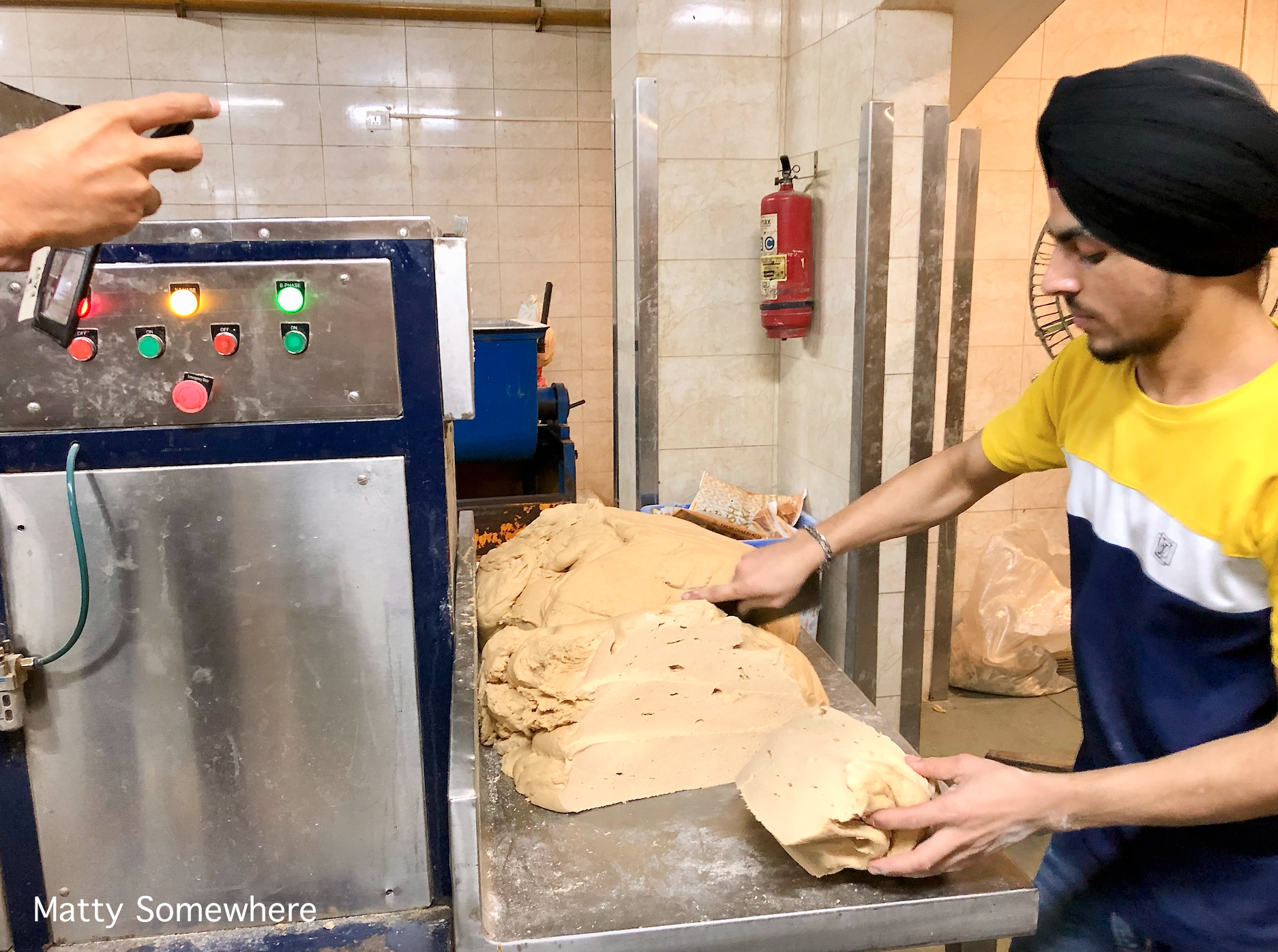 So this is where one of many automatic chapati maker comes in. After a large chunk of dough is cut off, it is placed into the machine and comes out perfectly rounded, flattened and cooked chapati on the other side. This machine can make up to 1,800 chapati every hour!
