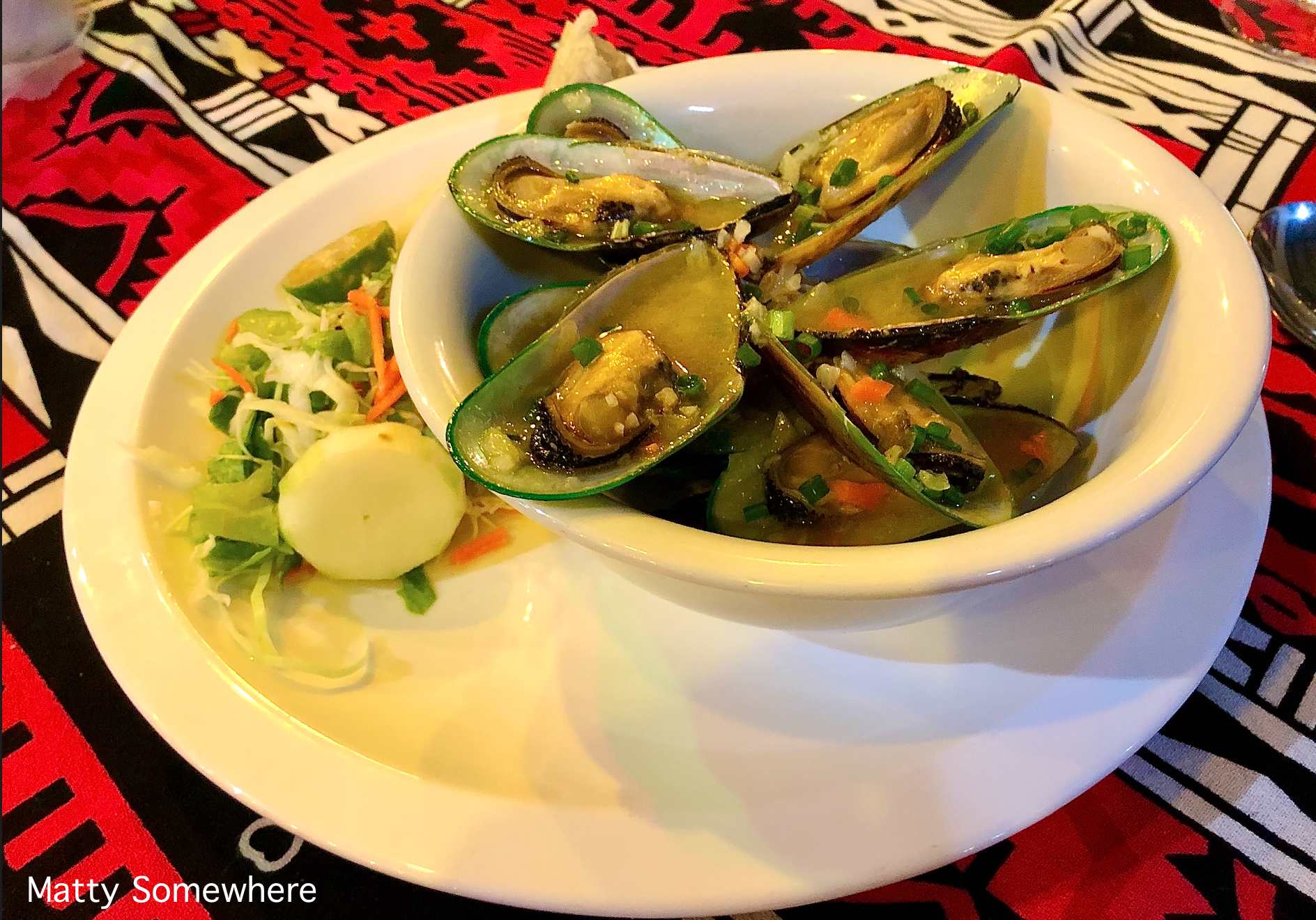 It’s not only the visual of each mussel in it’s half-shell, bathing in the garlic sauce and perfectly balanced around the bowl , it’s also the flavour that kept me saying ‘WOW”. Each mussel is perfectly cooked and the mirepoix of chopped vegetables, I feel, gave the sauce it’s richness. After I devour the last mussel, I use some steamed taro root (hidden behind the bowl) in lieu of bread to mop up the thick rich garlic sauce. This was sooo delicious!