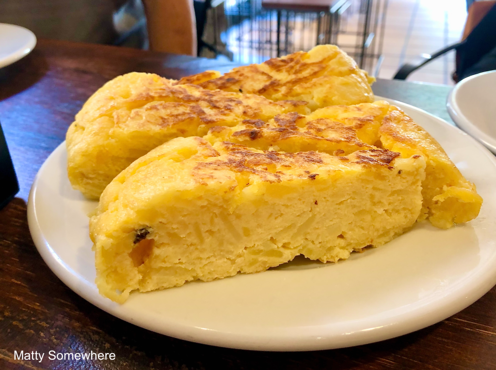 We start with tortilla de patatas – Spanish potato and egg tortilla or omelette. Apparently there is quite a national argument whether it should come with onions or not. This one doesn’t. While perhaps considered a cousin of the Italian frittata, the tortillas are only fried and not baked. It’s super soft and flavoursome, and a very good version (I’ve been eating these a lot, they’re as common as jamón, found in most cafes and take aways in Spain).