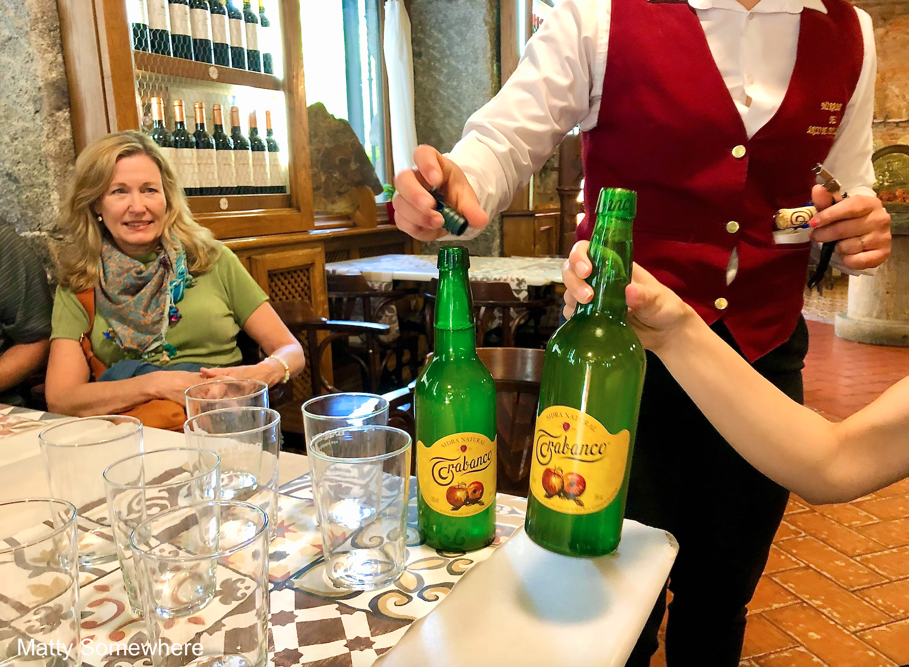We’re here to try authentic Spanish apple cider. This cider, produced in Asturias in northern Spain, is not exported and does not taste like the cider we are all familiar with. It’s not at all sweet, but rather sour, almost like vinegar, probably due to its short fermentation time of 2 months. There are some rules with drinking cider, first, it must be bought in a bottle, you can never buy just a=a glass. Second, it is poured using a pourer from great height, as far as you feel comfortable without it ending up all over yourself, this is to aerate the drink, and only small amounts are poured and shared amongst friends.