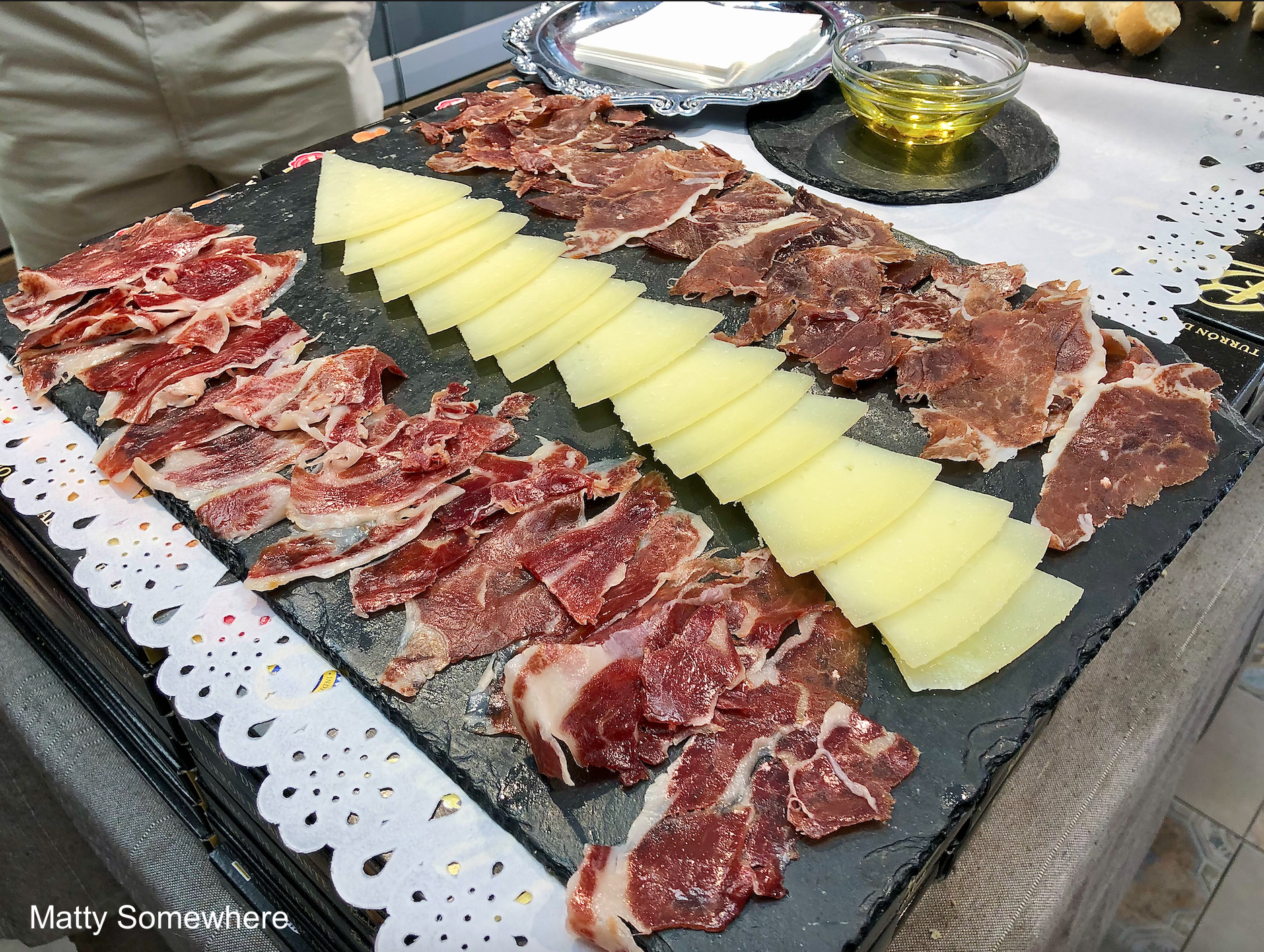 We enjoy these two types of Jamón Ibérico – Iberian ham – from ‘pata negra’ or ‘black hoof’ pigs. These types of ham are not for cooking, only curing. You may note that the jamón in the foreground has a deeper red colour and looks slightly oilier compared to that in the background… this particular jamón comes from acorn fed pigs, while the darker comes from grain fed. The pigs fed acorns then have an oilier content and deeper flavour due to the acorns having a high omega 3 oil content. It’s also the more expensive (and would have to be the one I prefer!). The manchego cheese is made from cows milk and is quite the accompaniment to the salty jamón.