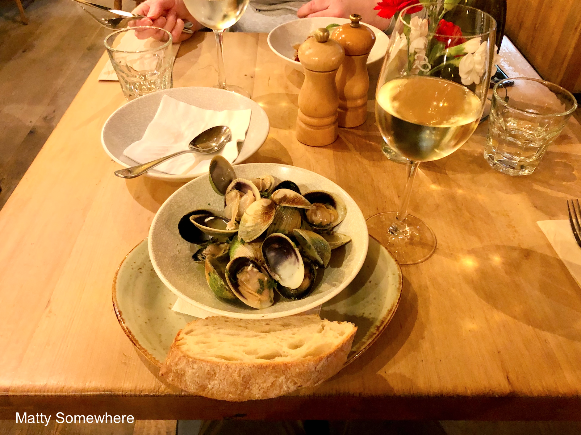 While the building may not be pretty from the outside due to renovations, the interior is warm and inviting. Old British pub vibes, dark wood and stained glass windows. We don’t have a booking and the place is almost full, but the waiter, who is quite jovial, looks around and says “whats your name?” I reply “Matt” and he says “oh yes I do have a table for a Matt!”.
