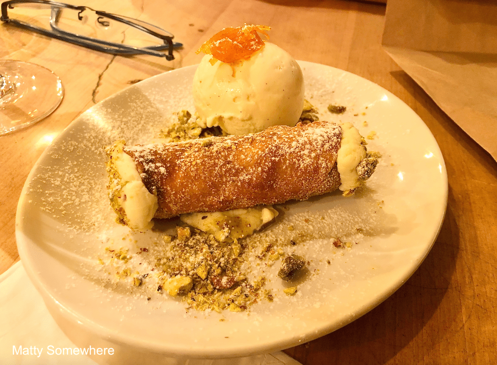 I love cannoli, Colleen doesn’t but I manage to convince her to try this dessert. It’s lovely and I think I may have converted her for a minute… alas, not so. However, we both do love the tangy candied citrus.