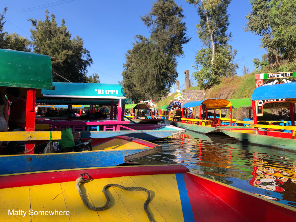 I’m with Craig, Jim, Abraham, and Chris on this afternoon adventure in Xochimilco, (pronounced zschochi-milco… I think). Located in the southern part of Mexico City, it’s known for its extensive canal system and home of the axolotl (yes.. that weird Mexican walking fish!). For us today, it’s a traditional relaxed boat ride on a colourful trajinera, enjoying the festive atmosphere with mariachi bands, Mexican food (and lots of (I mean lots) of tequila!).
