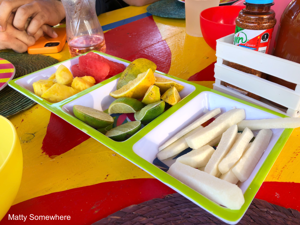 To start to ‘line the stomach’, there is watermelon and pineapple on the table (which looks a little sad) so I go for the slices of jímaca. These white French fry looking morsels are sometimes called Mexican turnip, and they hold absolutely no flavour at all.