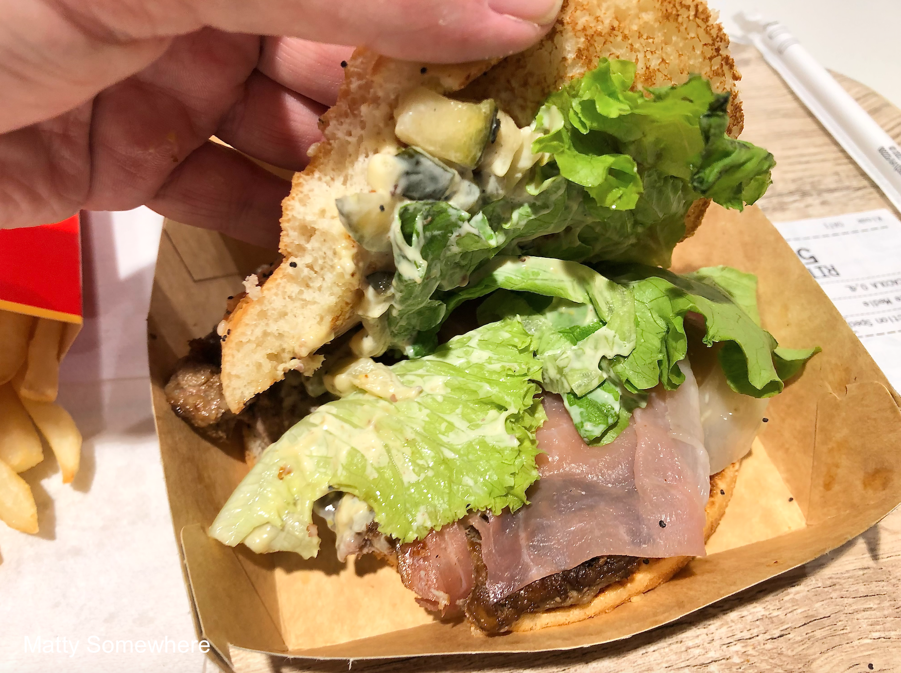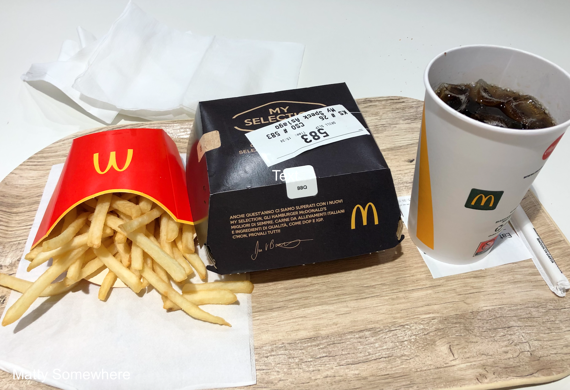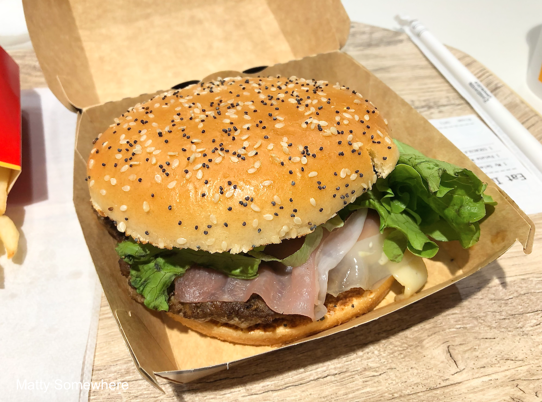 I’m in Florence and the need to try the local McDonalds. The usual rules apply: I must have fries for comparison; and I’ll try a burger that is not available in Australia. If there is something else quite different on the menu, like gazpacho in Madrid or congee in Penang, I’ll grab that too. This time I am trying the ‘My Selection by Joe Bastianich’ ‘Speck and Asiago Burger’, which sounds great and looks fantastic for a Macca’s burger. But you know what they say… it’s whats on the inside that counts…