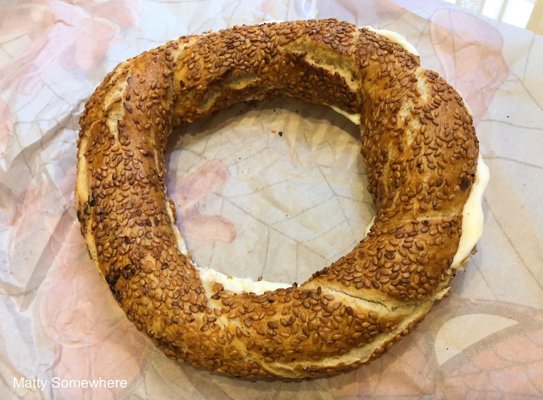 The tastiness has shone through, especially on the sesame seeds. Oh my this is delicious, crunchy yet chewy like an American bagel but not as sweet. It’s thinner, or narrower, in size, which gives it more of a crunch. The cheese spread is mild but a little more like feta, so there is a saltiness to it, but creamy. It’s the perfect way to start the day (even more so when only a dollar).