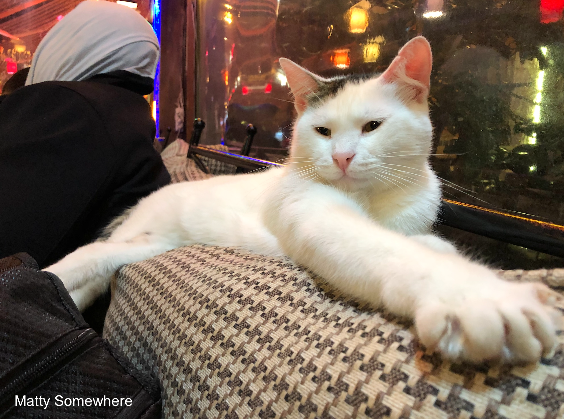 During this meal, I was again joined by a friendly feline, I named him Mehmet. He hoped up on the back of my chair, demanded a few pats, then stretched out and went to sleep – not at all interested interested in my food (probably eats here all the time).
