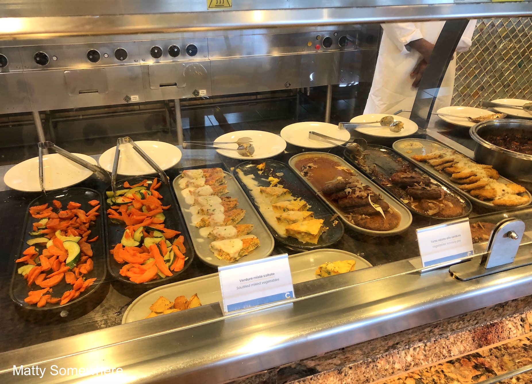 The buffet operates within specific timeframes: Breakfast from 7:00 to 10:30, Lunch from 12:00 to 16:00, Snacks from 16:00 to 17:30, and Dinner from 19:30 to 21:00. However, there is a limitation when it comes to accessing drinks as there is no dedicated bar within the buffet area, requiring passengers to go to the main bars or wait in lines at the smaller outdoor bar Lido via col Vento.