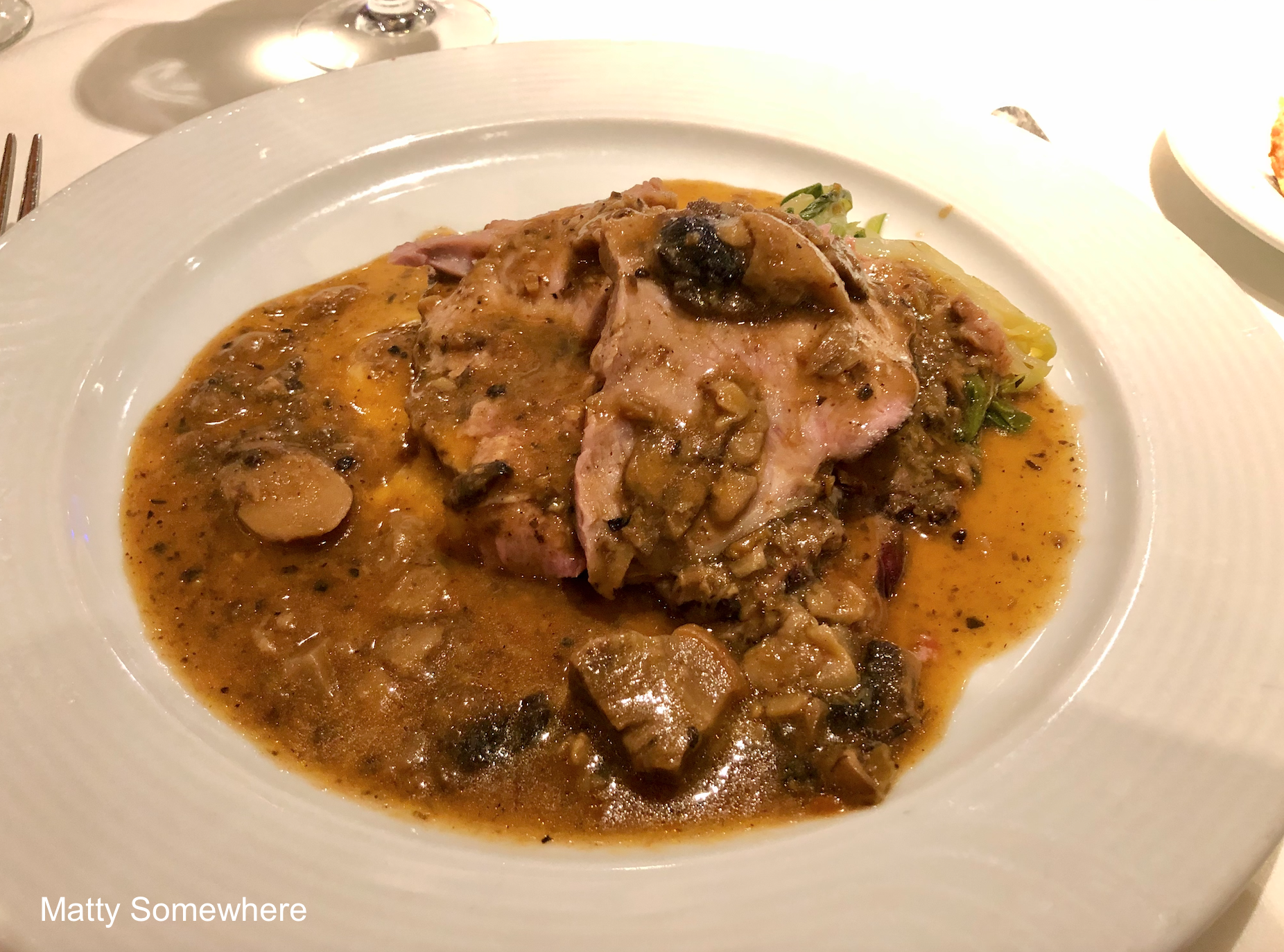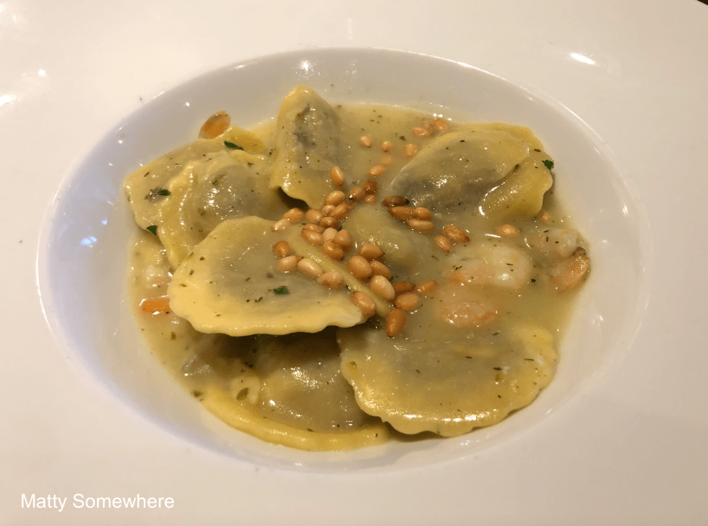 As an Italian cruise line, surely the pasta must be good… well, this one was. The ravioli stuffed with smoked Scamorza cheese and eggplant with zucchini cream, shrimp ragout and pine nuts was an outstanding dish. The Scamorza is an Italian semi-soft cows milk cheese that has a slight bite to it complimenting the earthy notes of the zucchini cream, shrimp ragout and pine nuts.