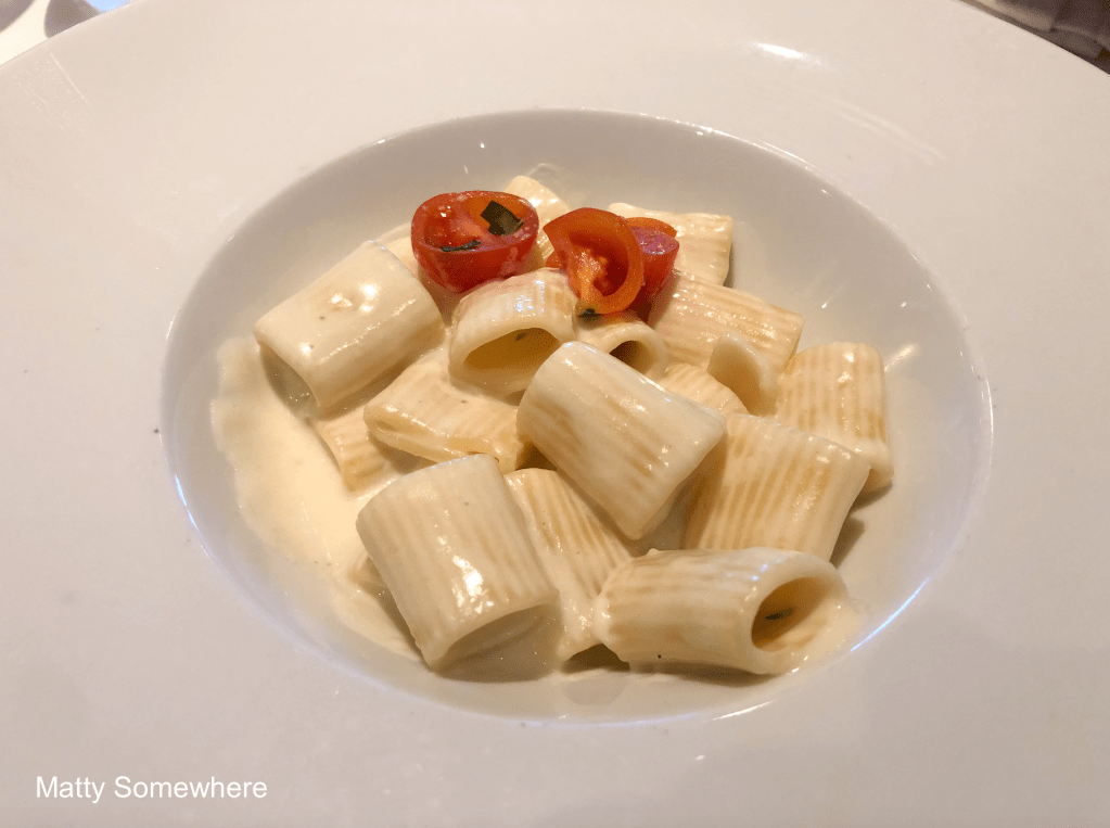 Looking more like a backpackers meal cooked up in a hostel, the rigatoni Amatriciana style: pork jowl, tomato sauce, Pecorino cheese and chilli, was tasty enough but I a sure the pork jowl is really just bacon.