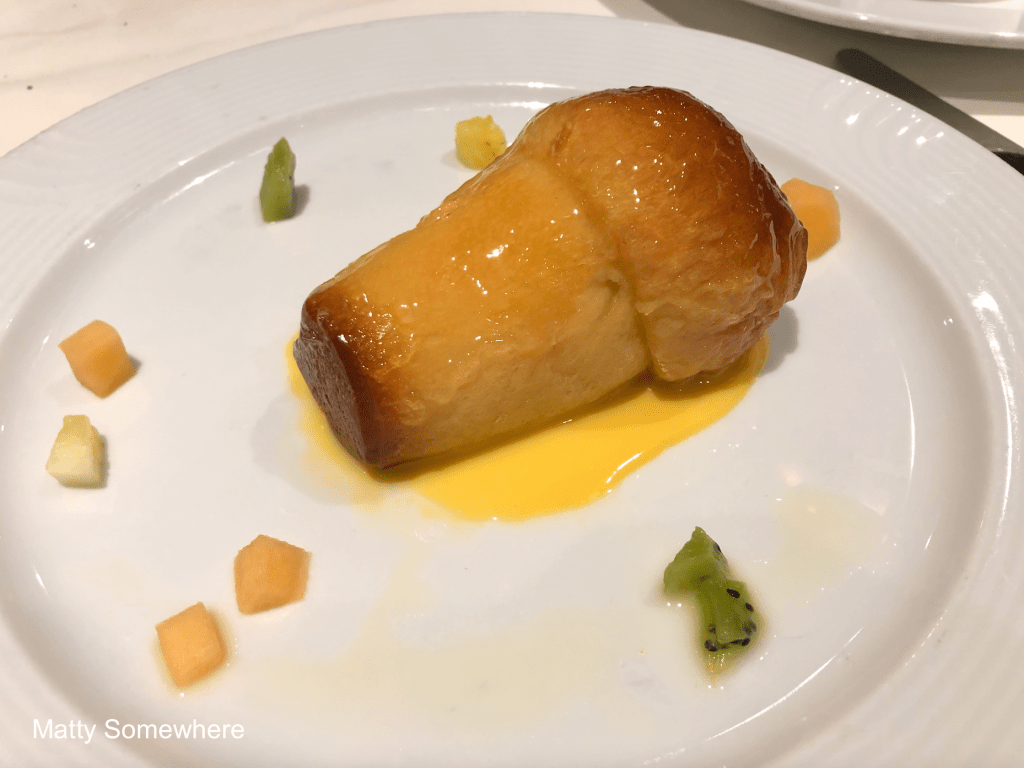 What is this? I don’t even know what Baba a rhum is, and i not sure I want to! This strange looking desert, Baba a rhum, eggnog sauce, small fresh fruit macedonia, (minuscule pieces of fruit dabbed around the plate). No flavour and very odd looking…
