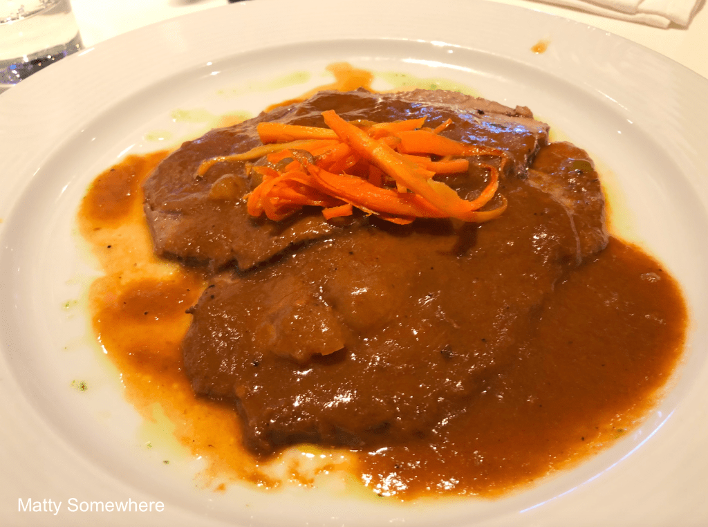 The Piedmont style beef in red wine sauce consisting of beef slices, appearing to be a budget cut, displayed sizeable fat globules, rendering the meat dry and tough. The red wine sauce, while acceptable, leaned towards a gravy like flavour and consistency.