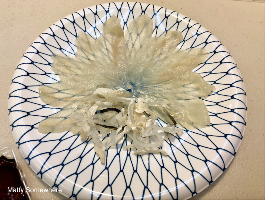 When served, fugu is often presented as sashimi (raw slices), hot pot, or even fried. The presentation is an art form, with thin, transparent slices arranged in beautiful patterns. The texture of fugu is delicate and slightly chewy, and it’s often served with dipping sauces and garnishes. Today, my serve comes sashimi sliced with ponzu dipping sauce with a serve of the skin alongside the beautiful patterned fugu.