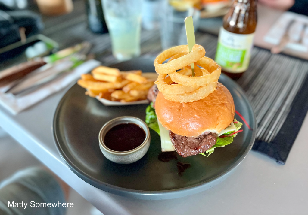 Matt chooses the steak burger, packed with fresh grated beetroot, Roma tomato, balsamic onion, Swiss cheese, lettuce, and tomato & fennel relish, all inside a toasted brioche roll. It’s served with golden fries, crispy onion rings, and smoky BBQ sauce—and he devours every bite with enthusiasm.